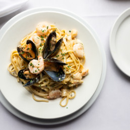 Linguini, shrimp, scallops, and clams, in a garlic cream sauce.